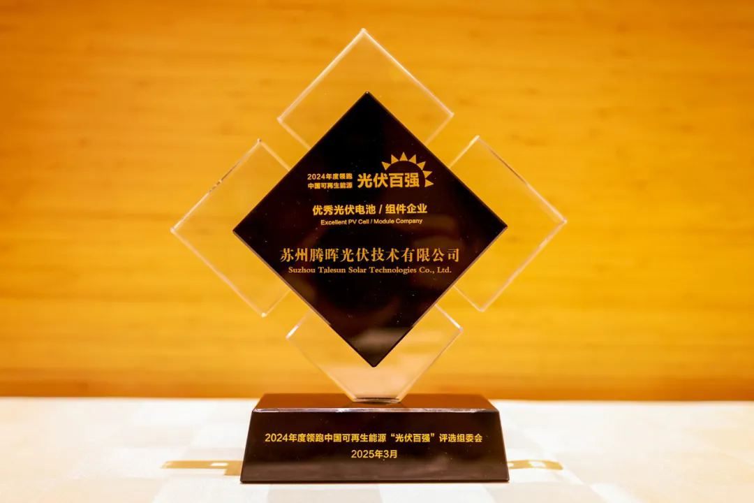 近日,由江蘇省可再生能源行業(yè)協(xié)會主辦的”第十二屆中國(江蘇)國際新型光伏創(chuàng)新發(fā)展大會”在南京隆重召開。蘇州騰暉光伏技術有限公司(簡稱”騰暉光伏”)作為新能源領域領軍企業(yè)之一受邀出席,并憑借卓越的技術創(chuàng)新實力榮獲”2024年度領跑中國可再生能源優(yōu)秀光伏電池/組件企業(yè)”稱號。本次大會匯聚政府主管部門、行業(yè)協(xié)會、科研機構及產業(yè)鏈上下游企業(yè)代表400余人,圍繞光伏技術前沿突破、市場趨勢研判、政策導向解讀等核心議題展開深度對話,共繪產業(yè)高質量發(fā)展藍圖。